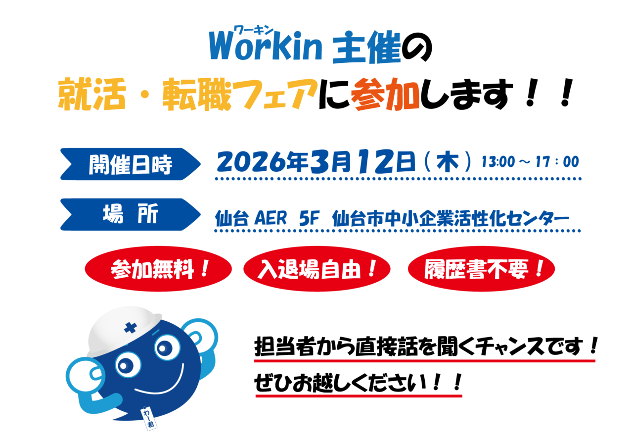 3/12(木)にworkin主催「就活・転職フェア in 仙台」に参加いたします!